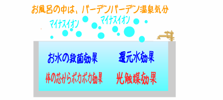 最大の特長は無用な有機物(トリハロメタンなど)を光触媒PIPチタンボール光触媒反応で分解してしまいます。そのため、お風呂に入れると刺激物がたくさん入った体に悪い影響を与える有害物質を分解するので、清潔なクリーンのお湯に変わります。